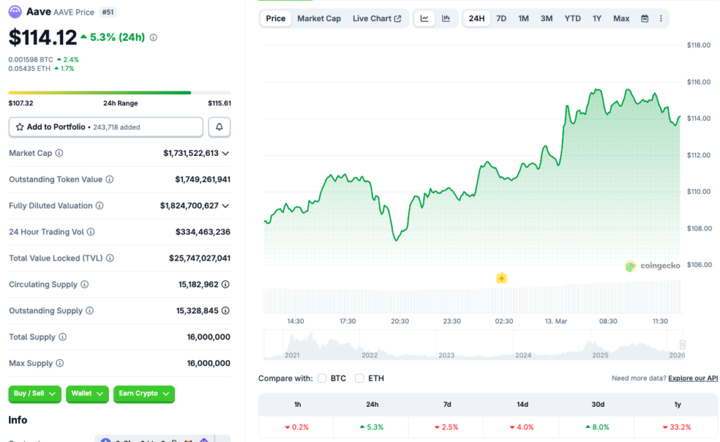 The cryptocurrency market seems to be making a recovery, with Bitcoin (BTC) testing the $72,000 price level once again. Aave (AAVE), despite one trader’s big loss, is also following the market-wide resurgence. According to CoinGecko data, the asset’s price has rallied 5.3% in the last 24 hours and 8% over the previous month. However, AAVE is still red in the other time frames, falling 2.5% in the weekly charts, 4% in the 14-day charts, and 33.2% since March 2025.